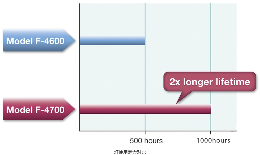 F-4700采用全新氙燈,并改良了燈電源,使得光源亮度提升,并有效延長(zhǎng)氙燈的使用壽命至1000小時(shí)。延長(zhǎng)燈泡更換周期可降低耗材成本,減輕燈泡更換等作業(yè)負(fù)擔(dān)。