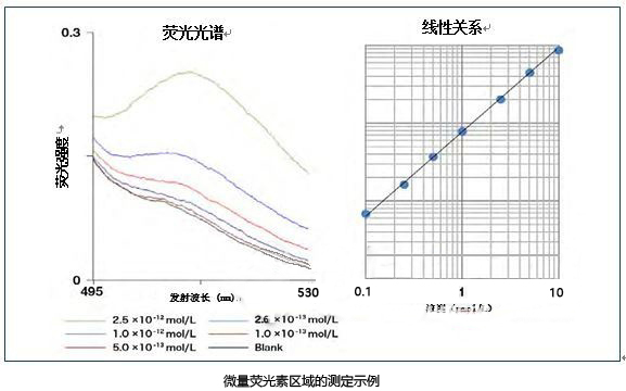 上圖表示以Blank(純水)為參照,超高靈敏度的檢測示例。使用F-7100 可檢測低至1×10-13mol/L(亞皮摩爾) 量級的熒光素。從線性曲線圖可知,即使在超微量區(qū)域,也能獲得很好的線性關(guān)系。