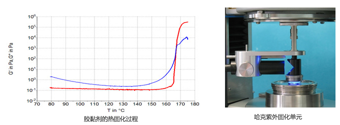 流變儀可以通過測試樣品粘彈性模量的變化全程監(jiān)測膠黏劑樣品的固化過程,包括熱固化和紫外固化,再配個哈克流變儀專利的流變 - 紅外聯(lián)用模塊,更可深入研究固化過程中樣品分子層面的變化,監(jiān)控反應動力學,反應度。