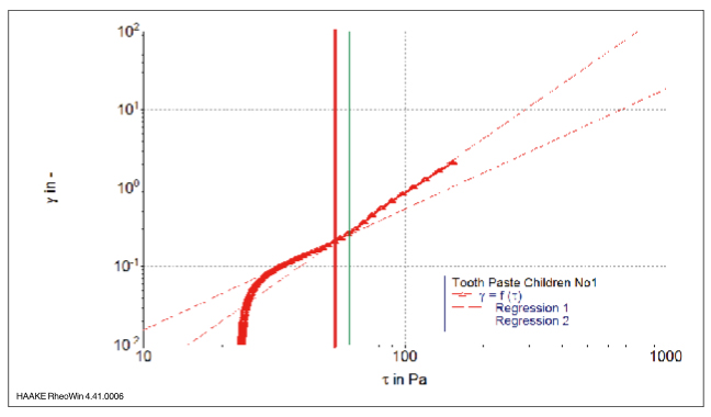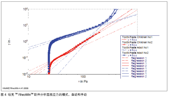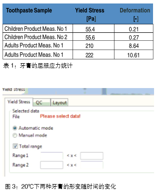 成人及兒童牙膏的測試曲線在圖3 中顯示。每個樣品進 行了兩次實驗,表現(xiàn)出極高的重復(fù)性。樣品的屈服應(yīng)力 總結(jié)在表 1 中。與預(yù)期的一樣,兒童牙膏的屈服應(yīng)力大 約為55Pa 左右,比成人牙膏的215Pa 低很多。哈克 TM RheoWinTM 軟件提供了兩種屈服應(yīng)力分析模式,自動和 手動(圖4)。當(dāng)儀器不連接軟件時,則只可以使用自動分析模式。手動模式進行分析在可以更加靈活的來進 行準(zhǔn)確的數(shù)據(jù)評估。通常用來評估屈服應(yīng)力的數(shù)據(jù)范圍 可以通過觀察直接得到,如表 1 中所顯示結(jié)果。但是屈 服應(yīng)力往往依賴于樣品準(zhǔn)備,測試過程以及評估方法。 圖 5 就給出了對于兒童牙膏才去自動模式和手動模式獲 得的結(jié)果的區(qū)別。