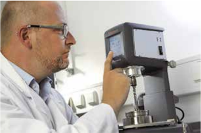 Viscotester iQ 智能流變儀進行 相關(guān)測試。這臺儀器使用的是EC 電機,可以完成各類 方法測試,包括控制速率及控制應(yīng)力,且覆蓋很寬的測 量范圍。溫控單元采用的是自帶帕爾貼系統(tǒng),可實現(xiàn) -5 到 160 ℃ . 區(qū)間快速穩(wěn)定的溫度控制。實驗使用直徑 35 毫米平行板夾具進行,為了防止打滑,采用了刻痕夾具。 測量下板與上板具有相同的直徑及表面,這樣可以保證 理想的測試條件及最優(yōu)化的樣品裝填 [3]。另外,這類夾 具需要的樣品量非常少,加樣時間和溫度平衡時間短, 并且容易清理。另外,在實驗中還使用了防揮發(fā)罩來降 低樣品內(nèi)部的水份蒸發(fā)和溫度梯度。