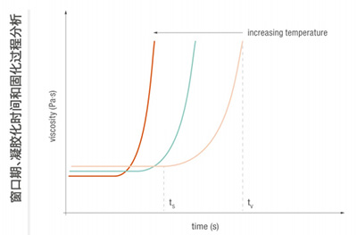 凝膠化時間和窗口期是黏合劑極重要的工藝參數(shù)。在化學(xué)固化反應(yīng)開始(ts)前,黏度保持恒定,在黏度接近無限黏度(t時,樣品固化日不能再使用。在恒定低切速率或旋轉(zhuǎn)速度進(jìn)行時間相關(guān)測試間和以分析窗口期凝膠化時固化過程