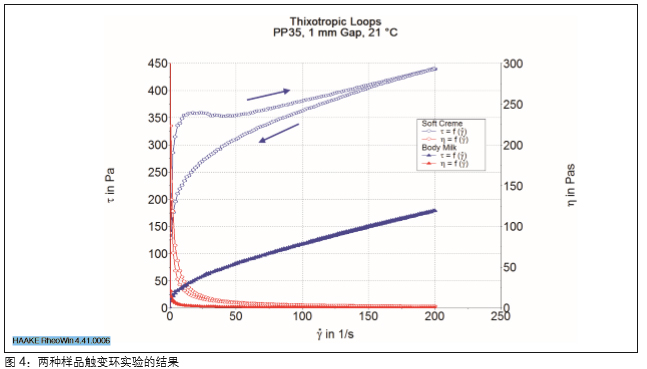 粘度 測試粘度的最佳方法測試樣品的穩(wěn)態(tài)粘度,例如穩(wěn)態(tài)粘 度隨剪切速率的變化。與瞬時粘度相比,穩(wěn)態(tài)粘度與時 間效應及剪切速率變化的斜率無關(guān)。在4 個數(shù)量級的剪 切速率范圍內(nèi),兩種樣品的粘度都表現(xiàn)出明顯的剪切變 稀行為,如圖2 所示。與預期的一樣,乳霜在低剪切 速率下表現(xiàn)出更高的粘度但是其剪切變形行為也更加明顯。在整個測試剪切速率范圍內(nèi),乳霜的粘度下降了幾 乎 500 倍,而護膚液的粘度下降率則只有 120 倍。根據(jù) 實驗高剪切速率下粘度結(jié)果可以推測出,當剪切速率超 過 2000s-1 時,兩種樣品的粘度應該幾乎一樣。這并不 是偶然現(xiàn)象,因為將乳霜或者護膚液涂在皮膚上時所產(chǎn) 生的的剪切速率就是在這個范圍內(nèi),而此時則是皮膚感 覺最好的,因此兩種產(chǎn)品在這個條件下的粘度應該一樣。 觸變性在質(zhì)控中,產(chǎn)品的觸變性行為通常使用“觸變環(huán)”來表 征。這種測試方法與其他方法相比的優(yōu)勢在于測試時間 短。此方法包含三個步驟,剪切速率從 0 上升到最高值 (本實驗中采用 200s-1),然后在此剪切速率下平衡一 段時間,再將剪切速率降低到 0(圖 3)。通常,剪切速 率上升和下降的時間是一致的,而穩(wěn)定時間則需要足夠 長以使得樣品的粘度在剪切速率下降之前不再變化。然 后通過計算上升曲線和下降曲線之間圍城的不規(guī)則“環(huán)” 裝的面積來評估實驗結(jié)果。觸變環(huán)面積越大,樣品的觸 變性越強。但是請注意,這個實驗的結(jié)果完全取決于實 驗參數(shù),比如最大剪切速率以及剪切速率變化斜率。只 有當剪切速率設(shè)置相同時(如圖3),不同測試結(jié)果才 可以相互比較。圖4給出了兩種樣品的觸變性實驗結(jié)果, 很明顯,乳霜是具有一定觸變性的,而護膚液在完全沒有。