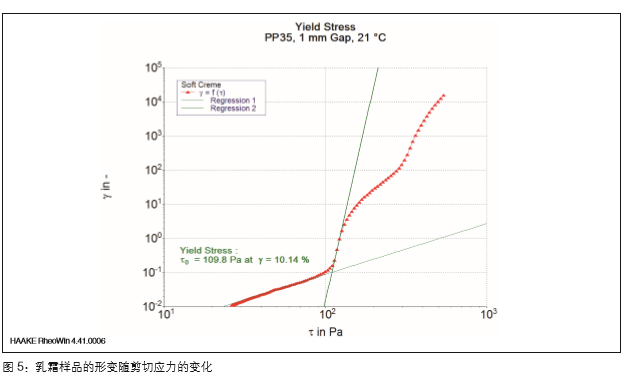 如果一個材料具有屈服應力,它在低于其屈服應力的剪切應力作用下會表現(xiàn)出彈性的性質(zhì),當剪切應力高于屈服應力時,則表現(xiàn)為液體的特性。因此,測試樣品是否具有屈服應力以及其大小的最好方法是直接線性增加剪切應力,然后觀察樣品性質(zhì)的變化 [1]。然后根據(jù)哈克 RheoWin 軟件的計算功來得到相應的屈服應力的評估數(shù)據(jù)(圖 5)。使用這種方法的優(yōu)點是,樣品在屈服應力前后的性質(zhì)都可以被記錄下來,而不用去進行額外的外推,這樣可以大大提高測試重復性以及計算數(shù)據(jù)的可靠性。從數(shù)據(jù)上看,護膚液幾乎沒有屈服應力,而乳霜則很明顯屈服應力,大約為 110Pa。