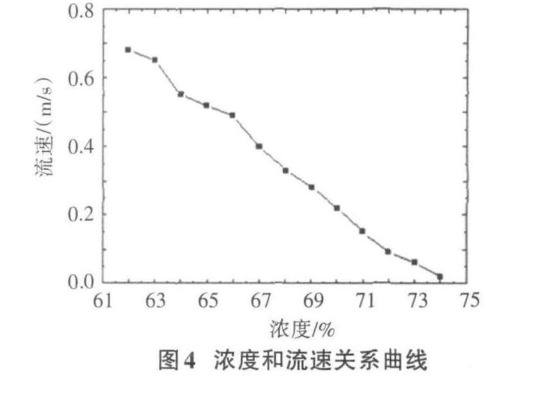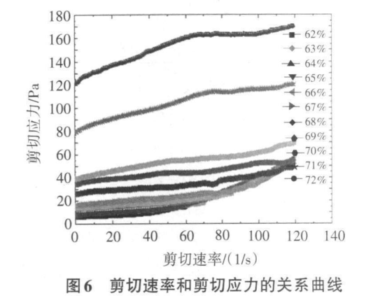 (1)在相同條件下,濃度越大,表觀粘度和剪應(yīng)力也越大坡度隨濃度的增加而增加,且在62%~70%范圍內(nèi),坡度隨濃度緩慢增加,當(dāng)濃度為70%以上時(shí),坡度增長加快。流速和濃度基本呈線性關(guān)系。