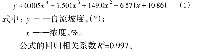 濃度和自流坡度關(guān)系曲線如圖3所示,將數(shù)據(jù)結(jié)果進(jìn)行回歸分析,得到回歸方程式(1)。 坡度隨濃度的增加而增加 ,且在62%~70%范圍內(nèi)坡度隨濃度緩慢增加。當(dāng)濃度為70%以上時(shí),坡度增長加快,這是膏體粘度增加,流動(dòng)性減小的緣故。