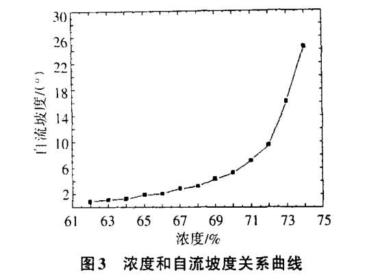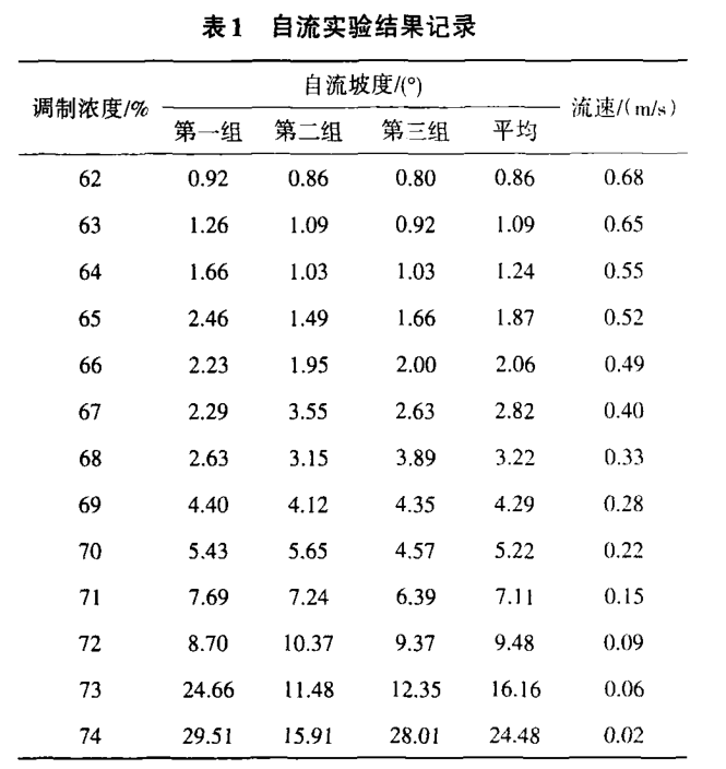 每組濃度進(jìn)行3次實(shí)驗(yàn) , 自流坡度取三者的平均值 ,實(shí)驗(yàn)結(jié)果如表1所示 。