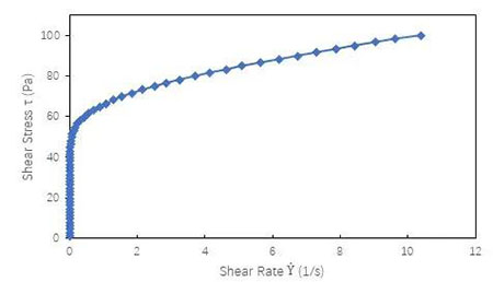 圖2為剪切率掃描曲線,使用Herschel-Bulkley模型進(jìn)行計(jì)算,得到屈服應(yīng)力為:63.6Pa。