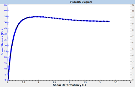 以剪切應(yīng)力為自變量,設(shè)置線性增長(zhǎng)的應(yīng)力斜坡。該方法獲得的屈服點(diǎn)是指:流體發(fā)生流動(dòng)之前的最大應(yīng)力值。將剪切應(yīng)力(y-軸)與剪切速率(x-軸)線性作圖(圖1),流動(dòng)曲線與y軸的交叉點(diǎn)即為屈服點(diǎn)。