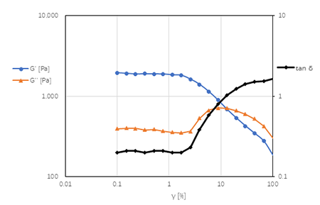 如果材料具有屈服點(diǎn),則屈服點(diǎn)以下發(fā)生較小的應(yīng)變時(shí),儲(chǔ)能模量(彈性行為)占主導(dǎo)作用,并且在一定的應(yīng)變范圍內(nèi),兩種模量均保持在一個(gè)恒定的水平,與應(yīng)變的變化無關(guān)。該區(qū)間發(fā)生的形變?yōu)閺椥孕巫儯环Q為線性粘彈區(qū)間。隨著應(yīng)變的不斷增加,兩種模量不再保持恒定,此時(shí)即為線性粘彈區(qū)間的終點(diǎn),也是屈服點(diǎn)。隨后,樣品的內(nèi)部結(jié)構(gòu)開始發(fā)生不可逆的破壞。如果G' 和G''這兩條曲線有交叉點(diǎn),則可以讀取此時(shí)的應(yīng)力值,作為樣品的流動(dòng)點(diǎn)。