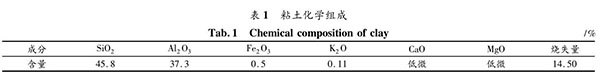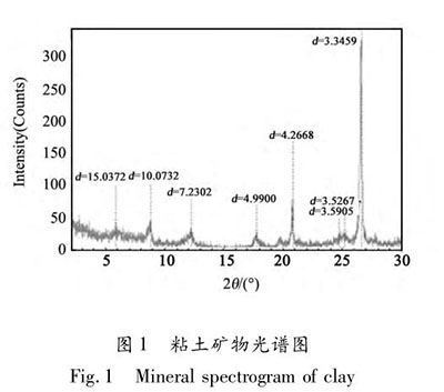 試驗(yàn)使用湖南懷化托口水電站料場(chǎng)粘土,其總體偏酸性,天然含水率在 20 ~30%,塑性指數(shù) >14,液性指數(shù)為 0. 3 ~0. 45,平均比重為2. 73。采用 ICDD 的 K值法對(duì)粘土進(jìn)行定量分析,礦物光譜見圖 1,光譜中埃洛石(Al 2 [Si 2 O 5 ](OH) 4 ·2H 2 O) 的典型特征峰 d =7. 2302,石英(SiO 2 )的典型特征峰 d =3. 3459,埃洛石中礦物含量為 74. 96%,石英含量為 19. 57%。對(duì)粘土進(jìn)行化學(xué)分析,測(cè)得其組分含量見表 1。試驗(yàn)所用水泥為湖南碧螺牌 P·O42. 5 普通硅酸鹽水泥。將粘土浸泡 24 h 以上,用高速攪拌機(jī)攪拌均勻,原漿比重為1. 25。