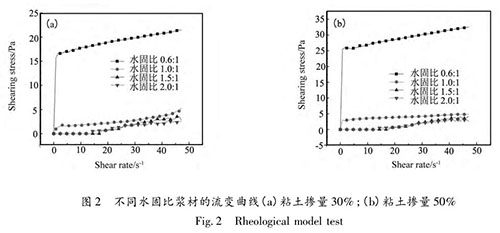 圖 2 可看出,當(dāng)水固比為 0. 6∶ 1 時(shí),粘土水泥漿材具有明顯的屈服應(yīng)力,剪切應(yīng)力隨剪切速率的變化規(guī)律服從線性分布,為賓漢流體;當(dāng)水固比為 1. 0∶ 1 時(shí),漿材仍存在屈服應(yīng)力,屬于賓漢流體;水固比增大到 1.5∶ 1 時(shí)、2. 0∶ 1 時(shí),漿材的流變曲線接近于通過原點(diǎn)的直線,近似為牛頓流體。