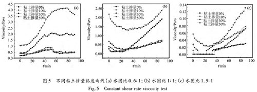 (3)粘土摻量對(duì)漿材的流變性能有較大影響。水固比為 1∶ 1 時(shí),粘土摻量較低時(shí),漿材為具有剪脹性的冪律流體,粘土摻量較高時(shí)為賓漢流體;水固比為 0. 6∶ 1 時(shí),漿材各時(shí)間點(diǎn)的粘度隨粘土摻量的增加而增大;