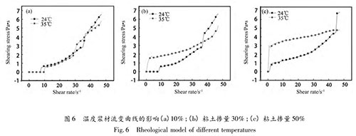 圖 6 表明,粘土摻量 10%時(shí),不同溫度條件下漿材的流型大體相同,均為具有剪脹性的冪律流體;粘土摻量 30%,當(dāng)溫度較低時(shí),漿材為剪脹性的冪律流體,溫度較高時(shí),服從賓漢流體,具有剪脹特性;粘土摻量50%時(shí),漿材流型為賓漢體,溫度較低時(shí)存在剪脹特性。當(dāng)粘土含量較低時(shí),溫度對(duì)漿材的流型產(chǎn)生微弱影響,可忽略不計(jì);當(dāng)粘土摻量較大時(shí),溫度對(duì)漿材的流變特性影響較大,不同的溫度條件下甚至服從不同的流型。