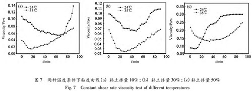 圖 7 表明,粘土摻量為 10% 和 30% 時(shí),各溫度下漿材的粘度隨時(shí)間先降低后增大,24 ℃條件下的漿材粘度較 35 ℃時(shí)大;當(dāng)粘土為 50%時(shí),20 min 前 35 ℃條件下的漿材粘度較 24 ℃大,20 min 后相反。