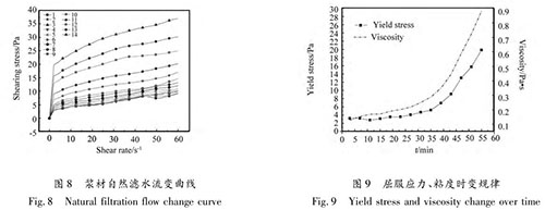 如圖 8、9 所示,水固比 1∶ 1,粘土摻量 30%的漿材為賓漢流體,隨時(shí)間增加,漿材的流變曲線整體上移;漿材的粘度和屈服應(yīng)力隨試驗(yàn)時(shí)間的增加逐漸增大。表明巖土體對(duì)漿材的吸附作用導(dǎo)致漿材中水分減少最終會(huì)影響漿材的流變特性,而流變特性會(huì)影響漿材的可灌性和擴(kuò)散距離等。