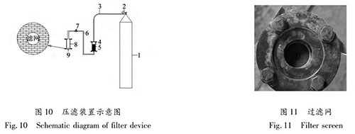 圖 10 中標(biāo)注如下:1-壓力源:為實(shí)驗(yàn)提供氣體壓力,工作壓力 12 ~15 MPa; 2-減壓器:量程為 4 MPa,工作壓力大于 2 MPa;3-輸氣管:連通壓力源與儲(chǔ)漿罐,工作壓力大于 2 MPa;4-儲(chǔ)漿罐:儲(chǔ)存漿液的容器,工作壓力不小于 4 MPa;5-灌漿漿材;6-輸漿管:輸漿管路為鋼絲皮管,工作壓力 4 MPa;7-簡(jiǎn)易閥門;8-壓力容器:其工作壓力不小于 4 MPa;9-過濾網(wǎng)。