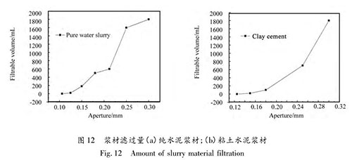 眾所周知,漿材在灌漿過程中會(huì)發(fā)生壓濾效應(yīng),已有研究成果表明壓濾效應(yīng)會(huì)對(duì)強(qiáng)度產(chǎn)生較大影響 [14] ,而關(guān)于發(fā)生壓濾效應(yīng)后漿材的流變性能的變化卻少有研究。產(chǎn)生壓濾效應(yīng)孔隙大小試驗(yàn)。圖 10、圖 11 為試驗(yàn)裝置圖。表 2 可知,兩種漿材壓濾前后密度、粘度均發(fā)生了變化。粘土水泥漿材的密度變化為 0. 075 kg/m 3 ,粘度變化為 0. 017 Pa·s;純水泥漿材的密度變化為0. 030 kg/m 3 ,粘度變化為 0. 0202 Pa·s。粘土水泥漿材密度變化較大,但粘度變化較小;純水泥漿密度變化較小,但粘度變化較大。圖 12 看出,相同水固比的兩種漿材通過同一目數(shù)濾網(wǎng)的量不一。濾網(wǎng)孔徑 0. 3 mm時(shí)幾乎全部通過,粘土水泥漿材濾過量在孔徑 0. 3 ~0. 25 mm 之間大幅下降,而純水泥漿在孔徑 0. 25 ~0. 18mm 之間大幅下降。說明同樣空隙的條件下,粘土水泥漿材發(fā)生壓濾效應(yīng)的程度更重。