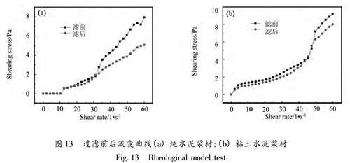 壓濾效應(yīng)前后的流變性能對(duì)比試驗(yàn)。對(duì)純水泥漿選取孔徑 0. 212 mm 的濾網(wǎng)進(jìn)行過濾,對(duì)粘土水泥漿選取孔徑 0. 25 mm 濾網(wǎng)進(jìn)行過濾。從圖 13 可知,純水泥漿材在濾過前后均為具有剪脹性的冪律流體,濾過前呈現(xiàn)出剪脹特性;粘土水泥漿材的流變曲線變化微小。漿材的壓濾作用對(duì)流變參數(shù)有影響,壓濾對(duì)粘土水泥漿的流變特性影響較純水泥漿小。