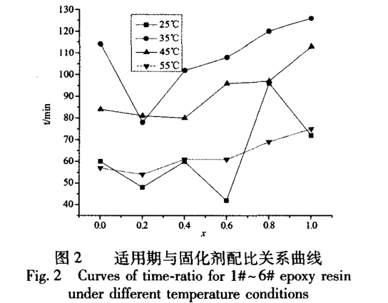 圖2為 25℃ 、35℃ 、45℃ 、55℃ 下適用期與固化劑配比的關(guān)系曲線。