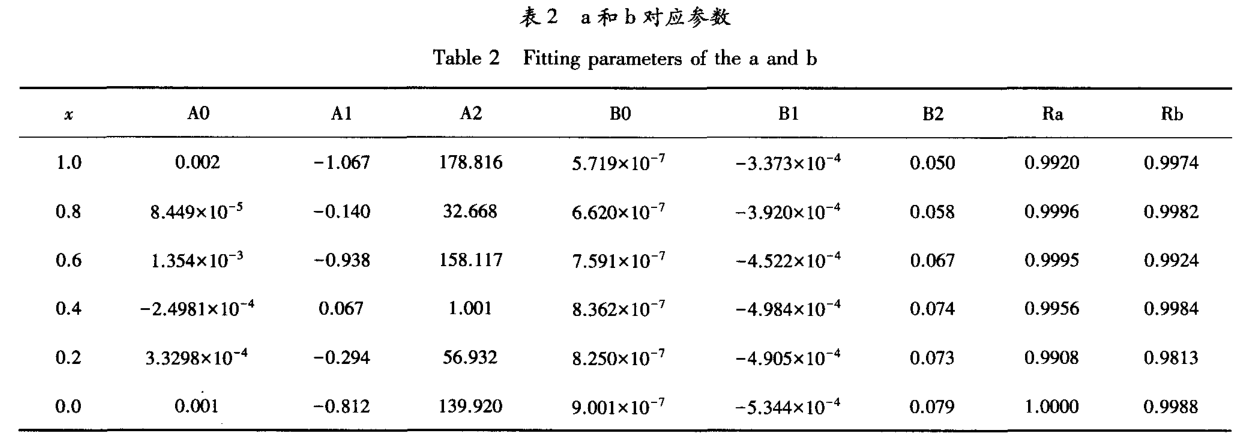 [18]中的計算方法,得到a,b相關(guān)參數(shù) ,如表 2所示。