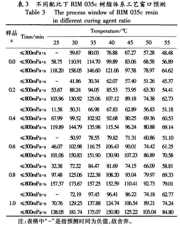 將擬合獲得的參數(shù)方程代 回實際曲線的擬合模型,模型中僅剩未知變量粘度 、溫度和時間 。 通過上述非常 規(guī)的二次 曲線擬合方法 , 獲得該環(huán)氧樹脂體系的等溫粘度與溫度和時間 的關(guān)系 。 本文以 300mPa?s、500mPa?s、800mPa?S三點為分界點,根據(jù)模型計算不同溫度下該樹脂體系從初始粘度上升至這三個粘度點所需要的時間,即為工藝窗口,如表 3所示 。