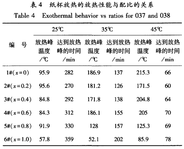 從表 4 中可以看出 ,在同一恒溫水浴溫度下,不同固化劑配比的環(huán)氧樹脂體系中使用單一固化劑RIMH?。埃常傅臉渲w系的放熱峰溫度最低 ,其在 25℃、35℃ 、45℃下的放熱峰溫度分別為 57.8℃、52.1℃ 、85.9℃,使用單一固化劑RIMH?。埃常?的樹脂體系的放熱峰溫度最高,其在 25℃、35℃、45℃下的放熱峰溫度分別為95.9℃ 、186.9℃、215.3℃,其他配比下的放熱峰溫度與單一固化劑RIMH?。埃常?的樹脂體系