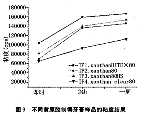 由圖 3 可知 ,不 同黃原膠制得 的牙膏樣 品粘度順序 :TPI—xanthan?。龋桑裕牛兀福埃?TP3 一xanthan 80HS> TP2 一xanthan80> TP4 一xanthan?。悖欤澹幔颍福?。