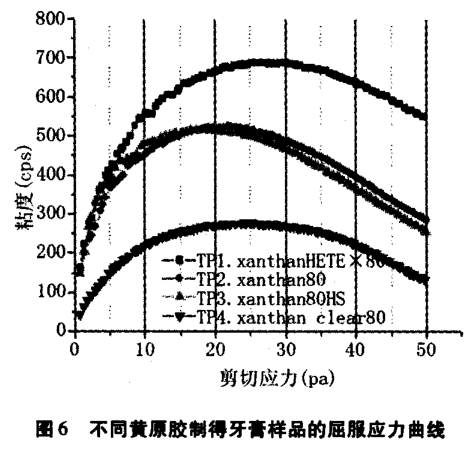 (3)屈服應力可體現牙膏的制造和包裝容易性,4 一xanthan?。悖欤澹幔颍福?更容易運輸, 洗刷分散性更好,更容易從牙膏管中擠出。