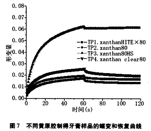 在很短的時間內樣品顯示出瞬間很大的形變,表明膏體具有彈性,在試驗時間內顯示出最小 量的變形,這兩點揭示樣品在貯存期間內膠水收縮作用較小,顯示了更好的穩(wěn)定性。 由圖 7 可知, 當剪切應力消除時,四個樣品都未能恢復至原始水平。 形變量越小,則體系越穩(wěn)定, 牙膏體系穩(wěn)定性 :TP1>TP2> TP4 >一TP3。