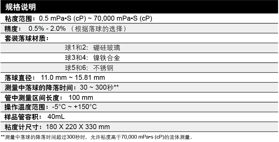 AMETEK Brookfield落球式粘度計(jì)采用簡(jiǎn)單而精確的 Hoppler原理,通過測(cè)量落球在重力作用下經(jīng)樣品管降落所需的時(shí)間而測(cè)得牛頓流體的粘度。