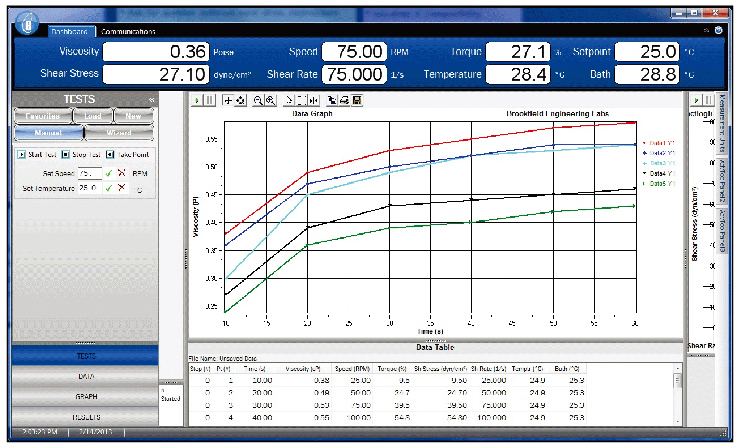 RheocalcT軟件可以用來(lái)分析數(shù)據(jù),生成多層圖形,打印數(shù)據(jù)列表,運(yùn)行數(shù)學(xué)模型以及一些其他的省時(shí)省力的例行功能??衫L制并保存高達(dá)5組的比較數(shù)據(jù)。