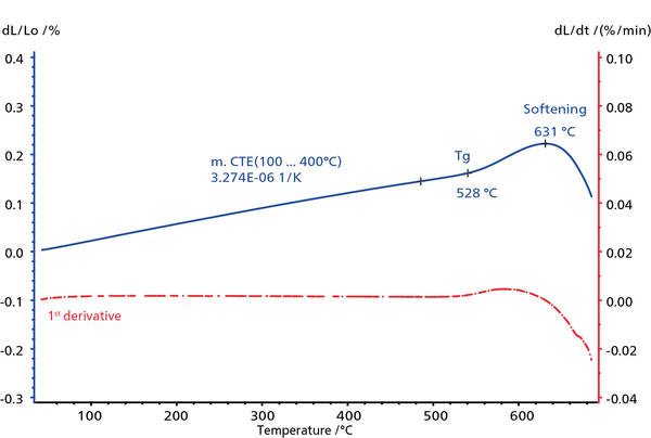 硅酸硼材料具有低膨脹、高度抗沖擊等眾所周知的特性。此外,這種玻璃制品還具有優(yōu)異的光學(xué)、化學(xué)和機(jī)械性能,能夠應(yīng)用在植入式醫(yī)療器械和太空探索等對(duì)產(chǎn)品具有較高要求的領(lǐng)域。下圖顯示了硅酸硼玻璃在室溫至 700°C 之間的熱膨脹過(guò)程。在 528°C(起始點(diǎn))時(shí),檢測(cè)到了樣品的玻璃化轉(zhuǎn)變,軟化則發(fā)生在 631°C。