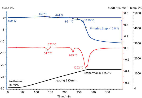 在瓷器生坯的加熱過(guò)程中,高嶺土的脫羥基過(guò)程發(fā)生在 450°C 至 570°C 之間,在這個(gè)過(guò)程中形成了莫來(lái)石結(jié)構(gòu)(熱膨脹的峰值溫度為 467°C(藍(lán)色曲線),對(duì)應(yīng)一階微分曲線上的峰值溫度為 517°C(紅色曲線))。在這個(gè)溫度范圍內(nèi),由于粘土晶體結(jié)構(gòu)中結(jié)晶水的釋放從而導(dǎo)致了樣品大約 0.4% 的收縮。一階微分曲線上峰值溫度為 572°C 的峰體現(xiàn)了石英α晶型→β晶型的轉(zhuǎn)變。通過(guò)進(jìn)一步觀察,在 961°C 發(fā)生的效應(yīng)(藍(lán)色曲線),對(duì)應(yīng)一階微分上峰值溫度為 985°C(紅色)的峰是由于高嶺土結(jié)構(gòu)的破壞和 γ-Al2O3 的形成[1]。隨著長(zhǎng)石的完全熔化和莫來(lái)石的形成,1159°C 開(kāi)始的兩個(gè)燒結(jié)步驟的總收縮率為 10.8%。