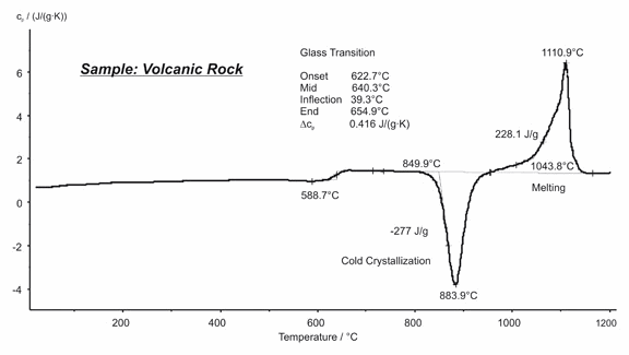 巖石作為一類化學組成非常復雜的天然材料的泛稱,一般很難進行分析。這類材料通常是多種多樣的氧化物,硫酸鹽或碳酸鹽的混合物?;鹕綆r通常由熔融巖漿凝固而成,其主成分為多種氧化物。本例顯示了對于某種巖石材料的 DSC 測量結果。玻璃化轉變發(fā)生在 623°C 至 655°C 之間,在 884°C 與 1111°C 分別檢測到了冷結晶與熔融峰(均取峰值溫度)。冷結晶的放熱熱焓與熔融的吸熱熱焓相近,證明了該混合物接近于完全的無定形材料。