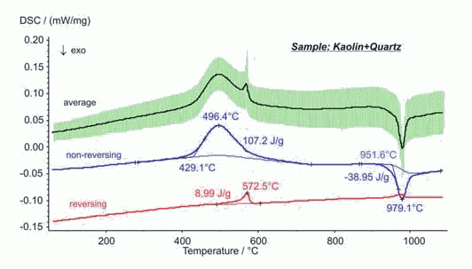 TM-DSC 通常被用于高分子材料的低溫測試,而 DSC 404 F1 Pegasus® 是世界上第一臺將TM-DSC應用到高溫測試的儀器。圖中顯示的是高嶺土石英混合物的測試結果。在DSC不可逆曲線上可以觀察到高嶺土不可逆的脫水過程和相變。,而DSC可逆曲線上則觀察到石英在 573°C 的相變效應。