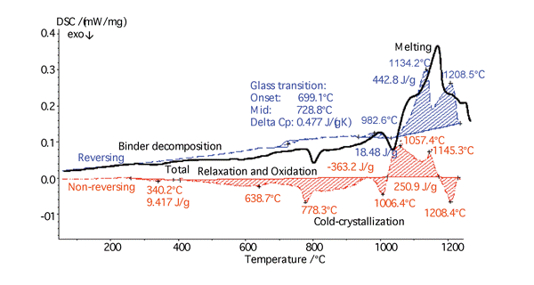 溫度調制 DSC(TM-DSC)是傳統(tǒng)上常用于測試聚合物低溫應用的工具。STA 449 F1 Jupiter® 和 DSC 404 F1 Pegasus® 是市面上最早實現(xiàn)高溫溫度調制的儀器。下圖所示為絕緣礦物纖維的測試結果。在 DSC 總熱流曲線中,馳豫、氧化和玻璃化轉變是重疊的。只有從分離得到的 DSC 可逆熱流曲線上,才能準確分析樣品的玻璃化轉變。