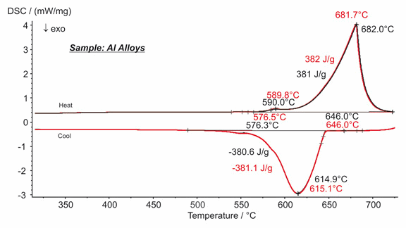 對(duì)某一鋁合金材料(Al-Mg-Si)取兩片樣品,使用 DSC 404 F3 Pegasus ® 進(jìn)行了測(cè)量,在升溫與降溫曲線中可以清晰地看到合金的熔融與凝固過程。兩片樣品的測(cè)試結(jié)果幾乎完全吻合,不管對(duì)于升溫與降溫,其特征溫度(起始點(diǎn),峰值)差別均在 0.3K 以內(nèi)。峰面積的差別均小于 1%。兩次測(cè)量結(jié)果間的良好的一致性表明了 DSC 404 F3 Pegasus® 的測(cè)量重現(xiàn)性。
