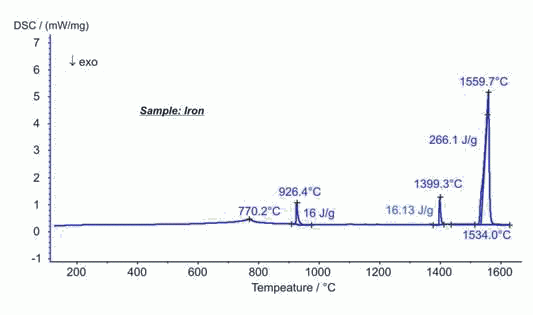 這個(gè)數(shù)據(jù)是在配備銠爐體的DSC 404 F3 Pegasus® 上測(cè)試得到的,實(shí)驗(yàn)溫度從室溫至1620°C。在770°C處出現(xiàn)的峰是材料的磁性能發(fā)生變化(居里轉(zhuǎn)變)引起的。926°C和1399°C處的峰是材料的晶型轉(zhuǎn)變引起的??赡苁且?yàn)樵摌悠分羞€有雜質(zhì),得到的數(shù)據(jù)與文獻(xiàn)值略有差別。熔融出現(xiàn)在1534°C,熔融熱為266.1J/g,與純鐵的文獻(xiàn)值偏差為1.5%