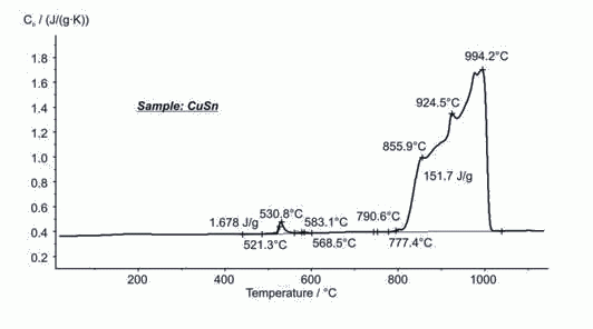 青銅合金是一種銅基合金,在古代人們就開始用它作為武器、容器或其他的金屬制品。今天它還經(jīng)常被做成軸承和彈簧元件。根據(jù)合金中錫的含量和添加劑的比例不同,合金的熔融行為會(huì)發(fā)生改變。圖中的合金樣品是用在滲透工藝中的。在521°C和568°C(起始點(diǎn))范圍內(nèi)樣品發(fā)生固相相變。熔融出現(xiàn)在777°C,整個(gè)熔程跨度超過200K,994°C后樣品完全熔化。