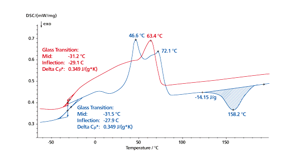 二次升溫時(紅色曲線),玻璃化轉(zhuǎn)變溫度與一次升溫幾乎相同。介于 40℃ 至 80℃ 之間的雙吸熱峰轉(zhuǎn)變?yōu)閷捈绶澹逯禍囟葹?63℃。晶層越厚,熔融溫度越高。因此,單吸熱峰到寬肩峰的轉(zhuǎn)變表明,由于第一次熱處理,樣品晶層厚度變薄。二次加熱過程中,沒有出現(xiàn)放熱反應(yīng)峰,說明放熱交聯(lián)反應(yīng)在一次升溫時已經(jīng)完成。