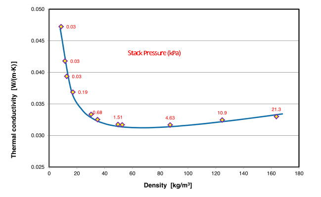因?yàn)?Netzsch HFM 具有可變載荷的功能,特別適合于測(cè)量可壓縮材料(導(dǎo)熱性能和密度有關(guān)),這里介紹的案例展示了絕熱玻璃纖維的熱傳導(dǎo)測(cè)量結(jié)果。當(dāng)載荷(載荷表示為表面壓力)增加時(shí),試樣逐步被壓縮,由于熱輻射的減少而導(dǎo)致綜合的熱導(dǎo)率下降,隨著壓力進(jìn)一步增大,由于試樣自身的熱傳導(dǎo)增加而使熱導(dǎo)率又有所上升。