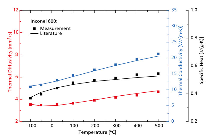 LFA 467:在一次測量中即可完成全溫度范圍的熱擴散系數(shù)測試。圖中樣品為 Inconel 600 標樣,實線為文獻數(shù)據(jù)。