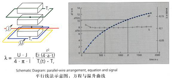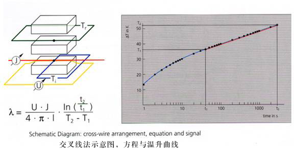 熱線法是一種動(dòng)態(tài)的,絕對(duì)的測(cè)量方法。使用熱線法測(cè)量導(dǎo)熱系數(shù)有多種方式,其中交叉線技術(shù)為測(cè)量線性熱源(熱線)的溫升,平行線技術(shù)則測(cè)量與線性熱源隔著一定距離的一定位置上的溫升。