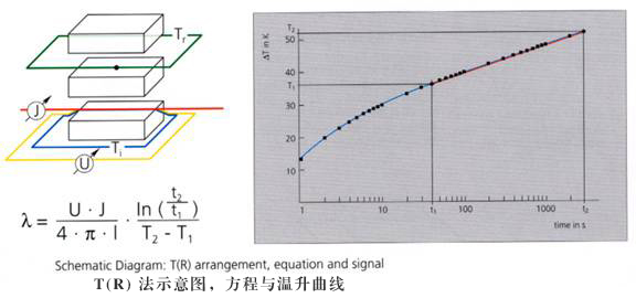另一種測(cè)量方式名為“鉑電阻測(cè)溫技術(shù)”或“T(R)技術(shù)”,符合ASTM-C1113標(biāo)準(zhǔn),是將熱線同時(shí)作為熱源與溫度傳感器,通過測(cè)量其電阻的變化來得到溫升數(shù)據(jù)。其導(dǎo)熱系數(shù)的計(jì)算方法則與交叉線技術(shù)相同。