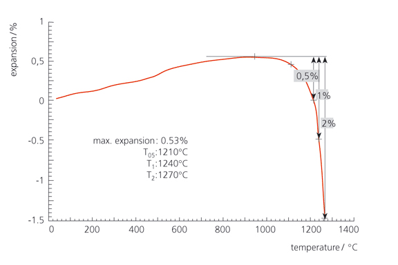 下圖顯示了從耐火磚(約含 35% Al2O3)上取得的試樣進行 RUL 測試得到的結果。測試條件:0.2 N/mm2,5 K/min,靜態(tài)空氣。試樣在 960°C 達到最大膨脹。在 1210°C(T05)、1240°C(T1)與 1270°C(T2)達到相應的 0.5%,1.0% 與 2.0% 形變。