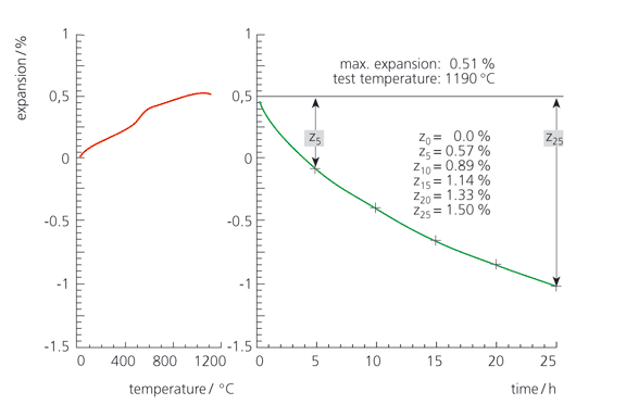 下圖顯示了從耐火磚(約含 35% Al2O3)上取得的試樣進行 CIC 測試得到的結果。測試條件:0.2 N/mm2,5 K/min,1190°C 恒溫 25 小時;靜態(tài)空氣。圖中左側為動態(tài)升溫曲線,右側為恒溫段的測試結果。