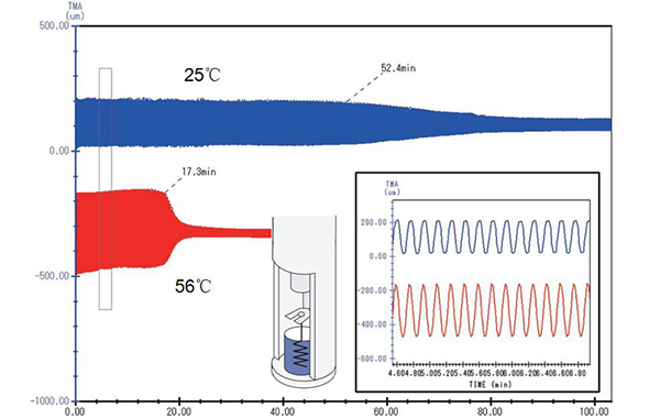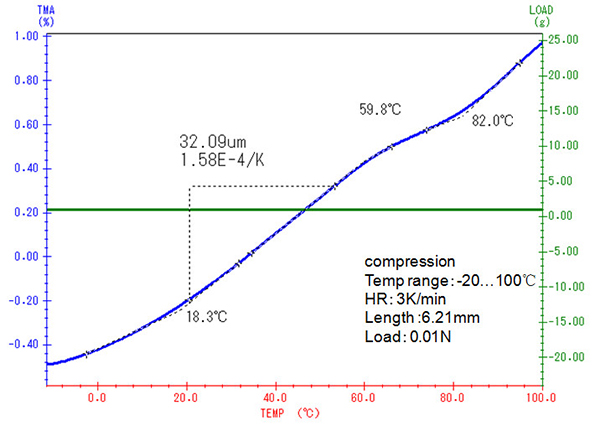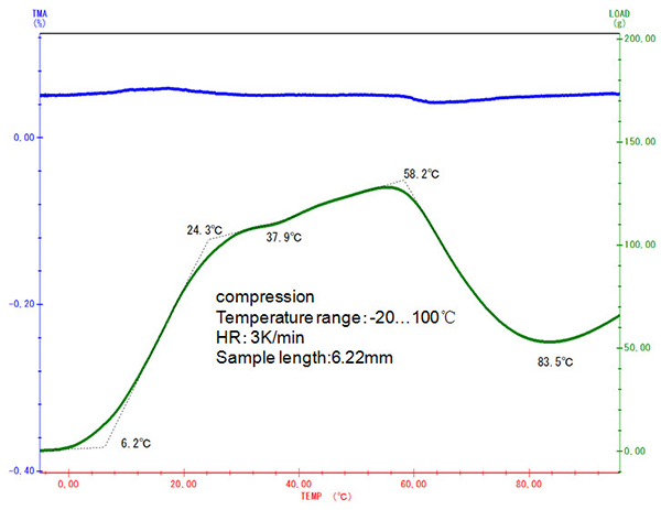 隨著溫度的上升,樣品的自然膨脹趨勢越來越大,要維持固定的壓縮形變量所需的力也相應(yīng)增大,直至自 58°C 起樣品發(fā)生玻璃化轉(zhuǎn)變之后,樣品模量下降,所需的負(fù)載力才相應(yīng)下降。