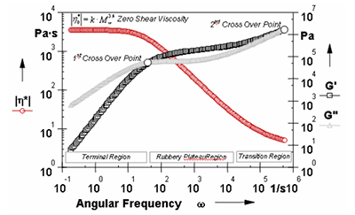 在低剪切或低角頻率下區(qū)域,聚合物的粘度與剪切速率或角頻率無關,即存在零剪切粘度。零剪切粘度是一個重要的材料參數(shù),直接和平均分子量 Mw的 3.4 次方成正比。