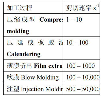 流動和粘度曲線反映了熱塑性材料在不同剪切和加工條件下的流動性能。大多數(shù)聚合物的加工采用塑化成型, 其過程覆蓋很寬的剪切速率范圍(如表1 所示)。為模擬不同的加工過程的流動性,我們需要在測量該加工過程的剪切速率下的粘度。